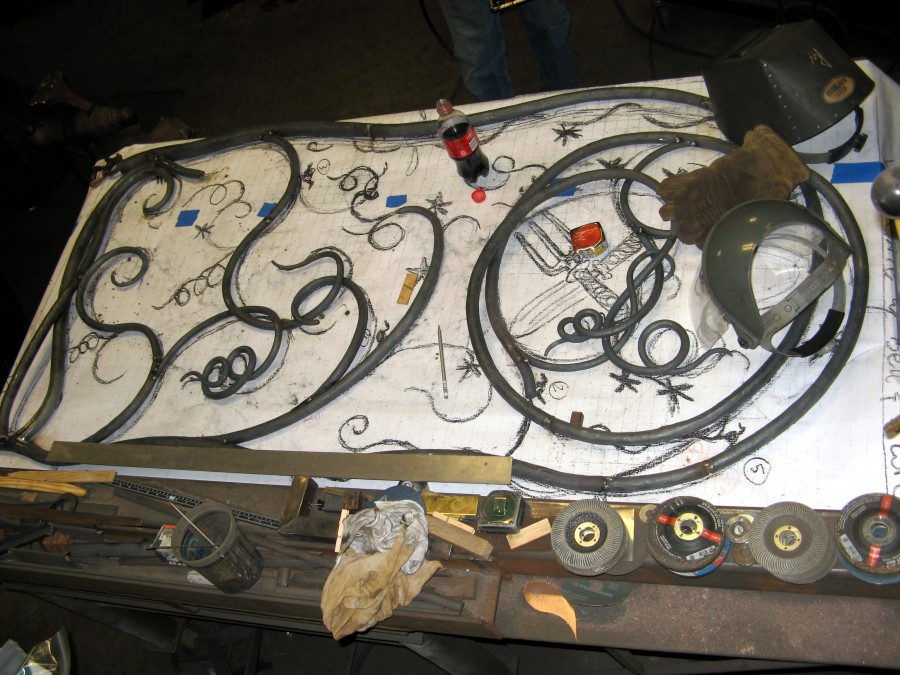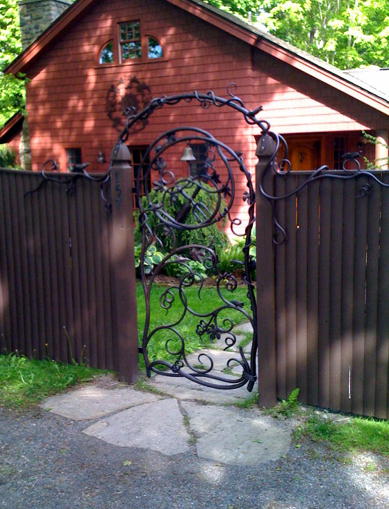 Garden Theme Gate with Wrens, Grape Vines, and Tools and the customers own Bell, as seen above. This entire gate was hand forged steel using the traditional blacksmith techniques. The steel is heated and worked into the exact size. The leaves were laser cut out of steel then placed into the fire to give them life. The detail of the veins is all hand chiseled. The wrens were steel tube and pieces of sheet metal all individually done to fit into the gate.